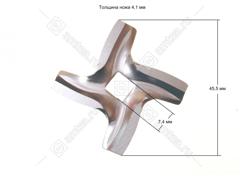 Ширина размаха лопастей 45.5 мм. Сторона внутреннего отверстия 7.4 мм. Толщина ножа 4.1 мм. Внутреннее отверстие - четырехгранник. Подходит к мясорубкам Moulinex HV3 (DRA, DRB), HV6 (DR7, DR8), HV8 (DKA1, DKA2), HV4, FOOD PROCESSOR ODACIO 3 (FP710141, FP716141)