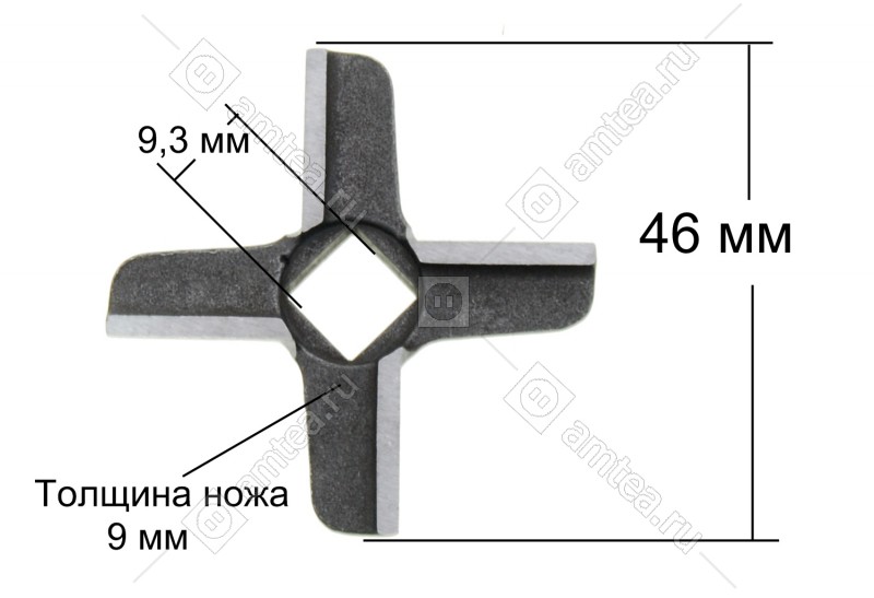 Ширина размаха лопастей 46 мм. Сторона внутреннего отверстия 9.3 мм. Толщина ножа 9 мм.